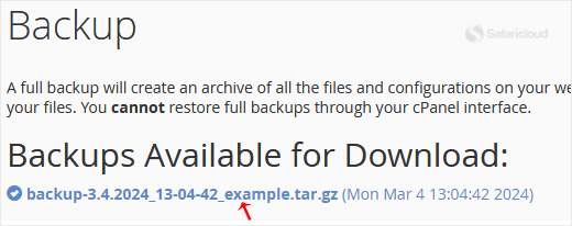 After the cPanel backup is finished, you will receive a notification. You can download backups from Backup > Download a Full Account Backup.