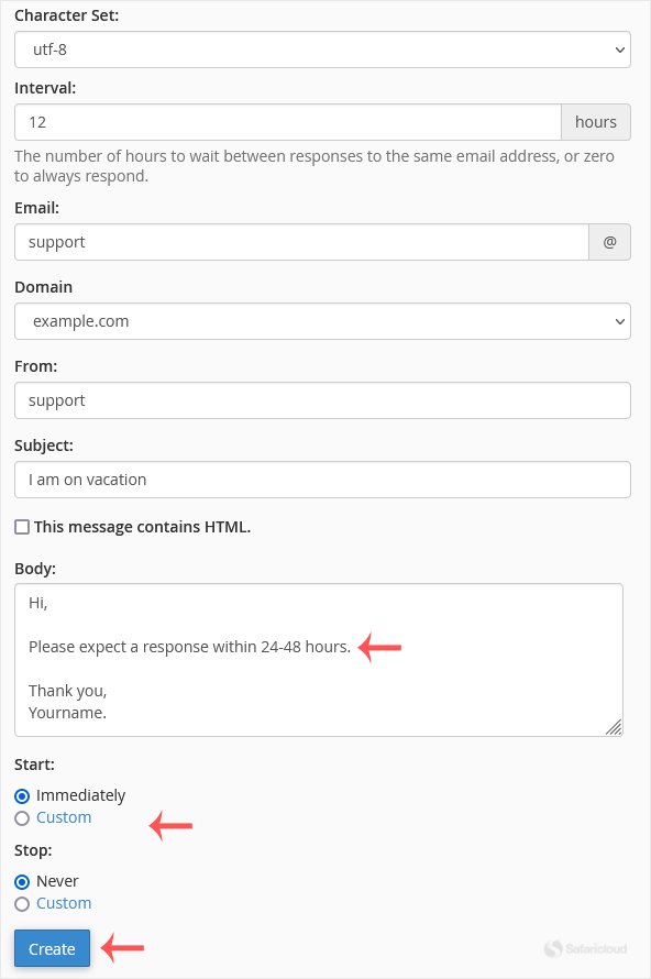 - Interval: Specify the number of hours you wish the autoresponder to wait between responses to the same email address.