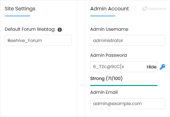 - Admin Username: Your new Beehive username (for security reasons, do not use the administrator or the admin username).