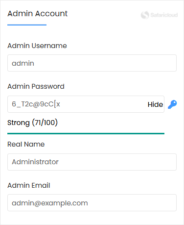 - Admin Username: Your new Saurus username (for security reasons, do not use the administrator or the admin username).